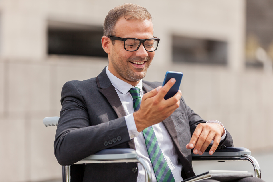 Businessman on wheelchair is phoningExisten distintas aplicaciones para móvil que tienen como objetivo mejorar la accesibilidad de las personas con problemas de movilidad.